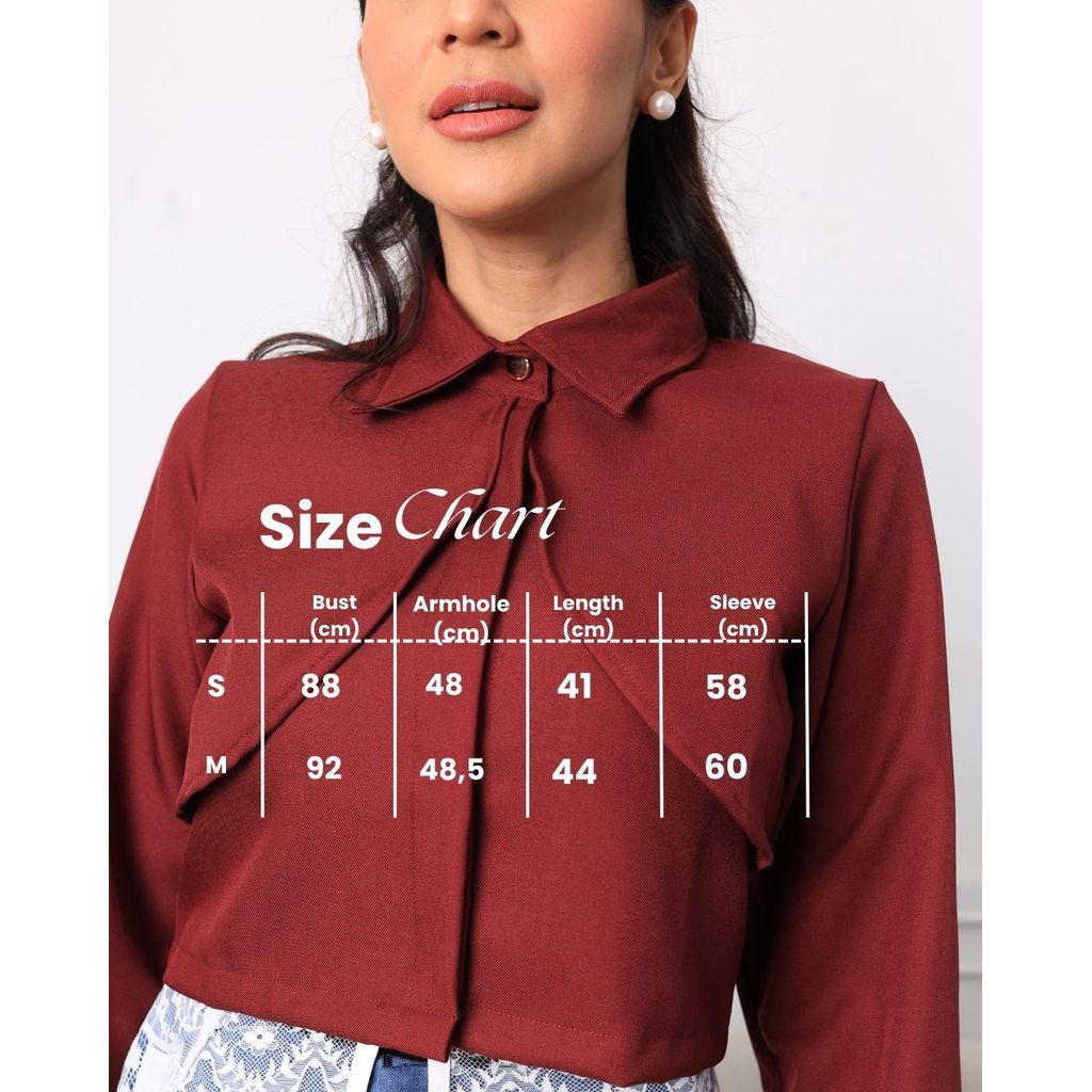 FREYA Top Marron is a stylish top with a touch of modern and feminine design, Cropped Top Model with a neat and elegant cut, equipped with a classic collar and pleated details on the front which gives a unique and structured impression and a warm and classy maroon color, suitable for casual and semi-formal events.